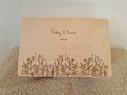 Herinneringsdoos met klepdeksel met geboortekaartje of tekst naar keuze